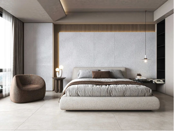淡雅灰调与木质床具搭配,醇厚的大地色系氛围,将时光的美好与生活的精致注入,让空间自带温暖和质朴感,留住一方岁月安宁。