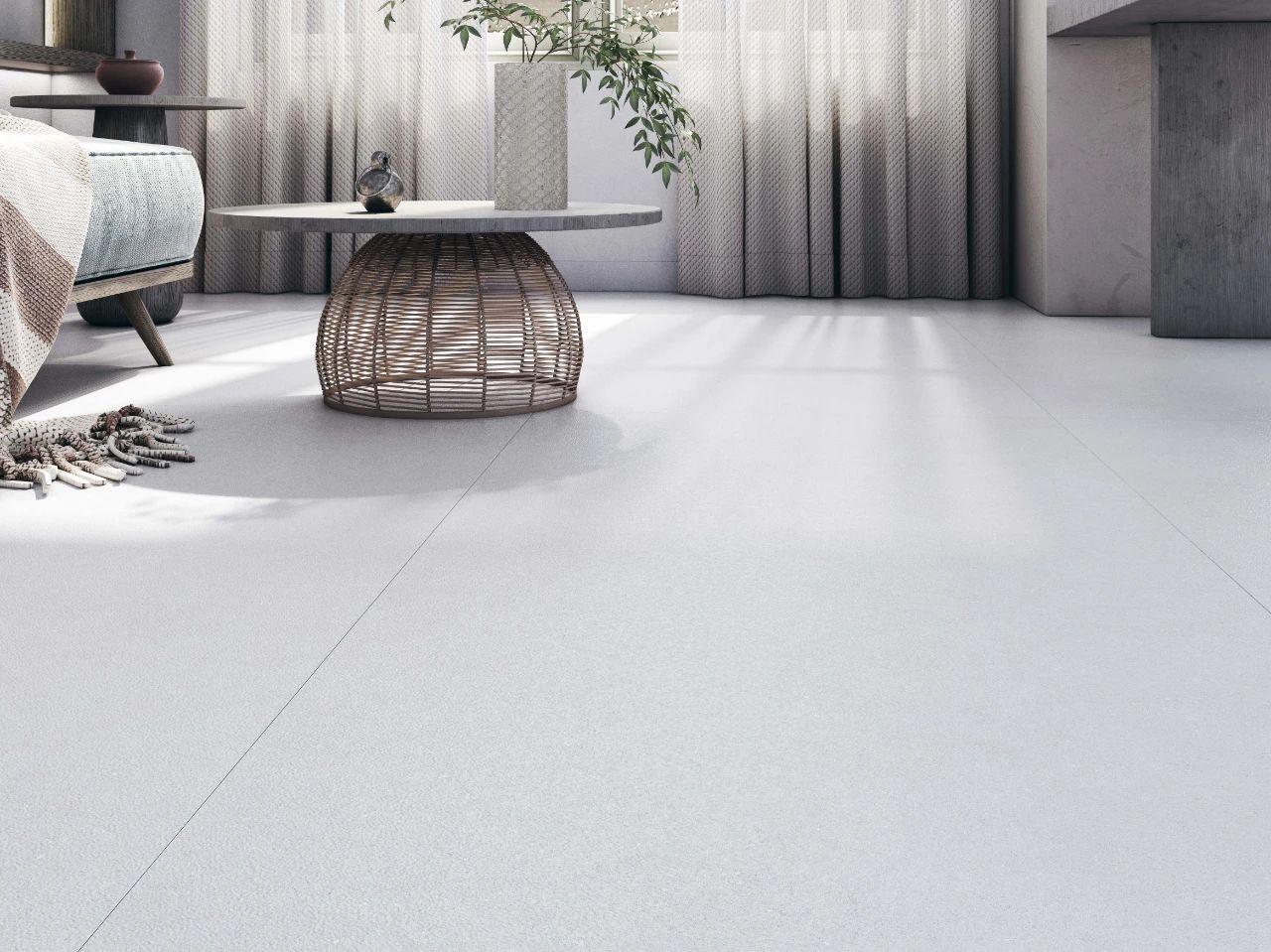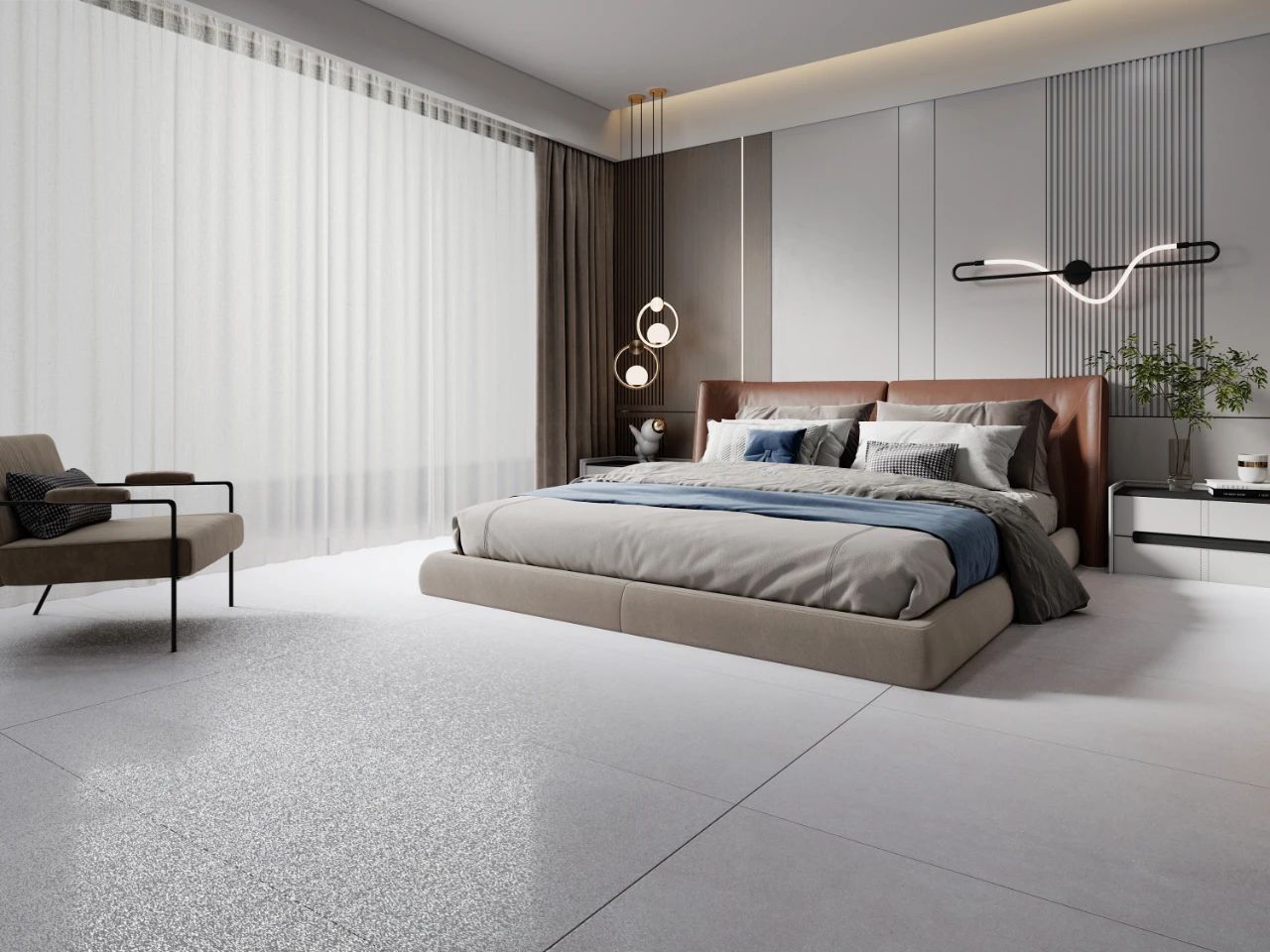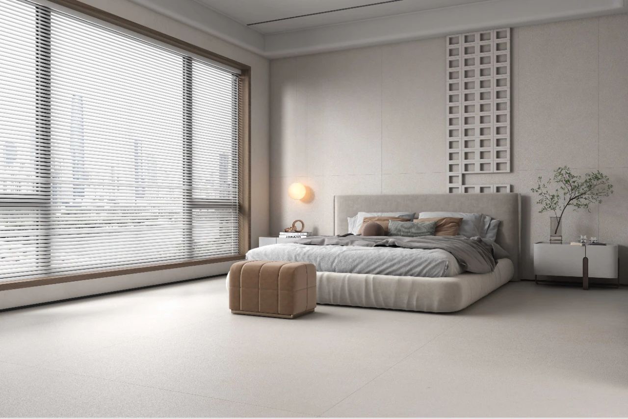 地面装饰可采用“宋素|凡古砖”,素雅肌理,低度光感,细腻质感,予以人视觉、触觉上的舒适感,搭配浅色或带有自然元素的软装,空间静谧安逸,更能有效助眠。