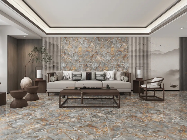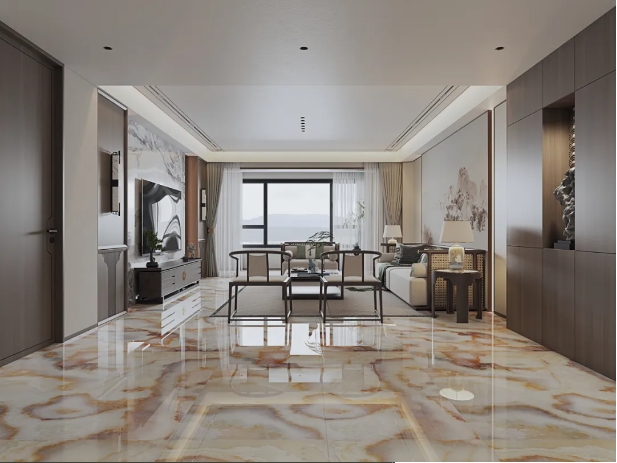 玛吉特】整体大面积上墙铺地,打造出大气磅礴的视觉张力,搭配新中式风格的家居软装,将高级与优雅平衡融入,尽显居者不俗